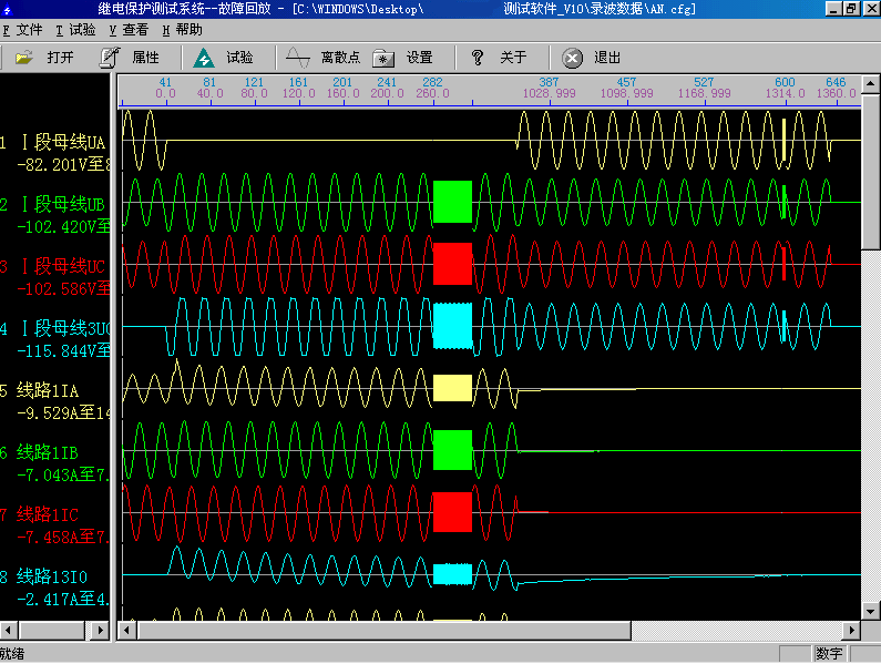試驗(yàn)前首先打開某一個(gè)記錄文件。記錄文件可以放在任何子目錄中,在“打開文件”對(duì)話框中查找,找到所在子目錄后程序會(huì)自動(dòng)將所有后綴為.CFG的文件名列出。選定某一文件后程序自動(dòng)將該名字的.CFG和.DAT文件調(diào)入,并將所有電壓電流波形及其通道名稱等顯示在屏幕上。另外還可以通過工具欄的按鈕查看文件屬性、波形離散采樣點(diǎn)等。