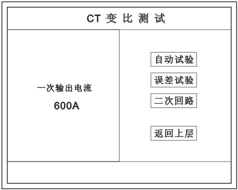 在主菜單界面,旋轉(zhuǎn)鼠標(biāo)將光標(biāo)移動(dòng)到 CT測試 選項(xiàng)上,按下旋轉(zhuǎn)鼠標(biāo)選擇 CT變比 即可進(jìn)入變比極性試驗(yàn)設(shè)置界面(如下圖)。光標(biāo)移動(dòng)至 返回上層 ,按下鼠標(biāo)即可返回主菜單。