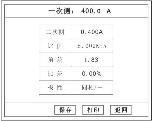 按額定一次的:1%、5%、20%、100%、120%取值,同時(shí)顯示出角差與比差。