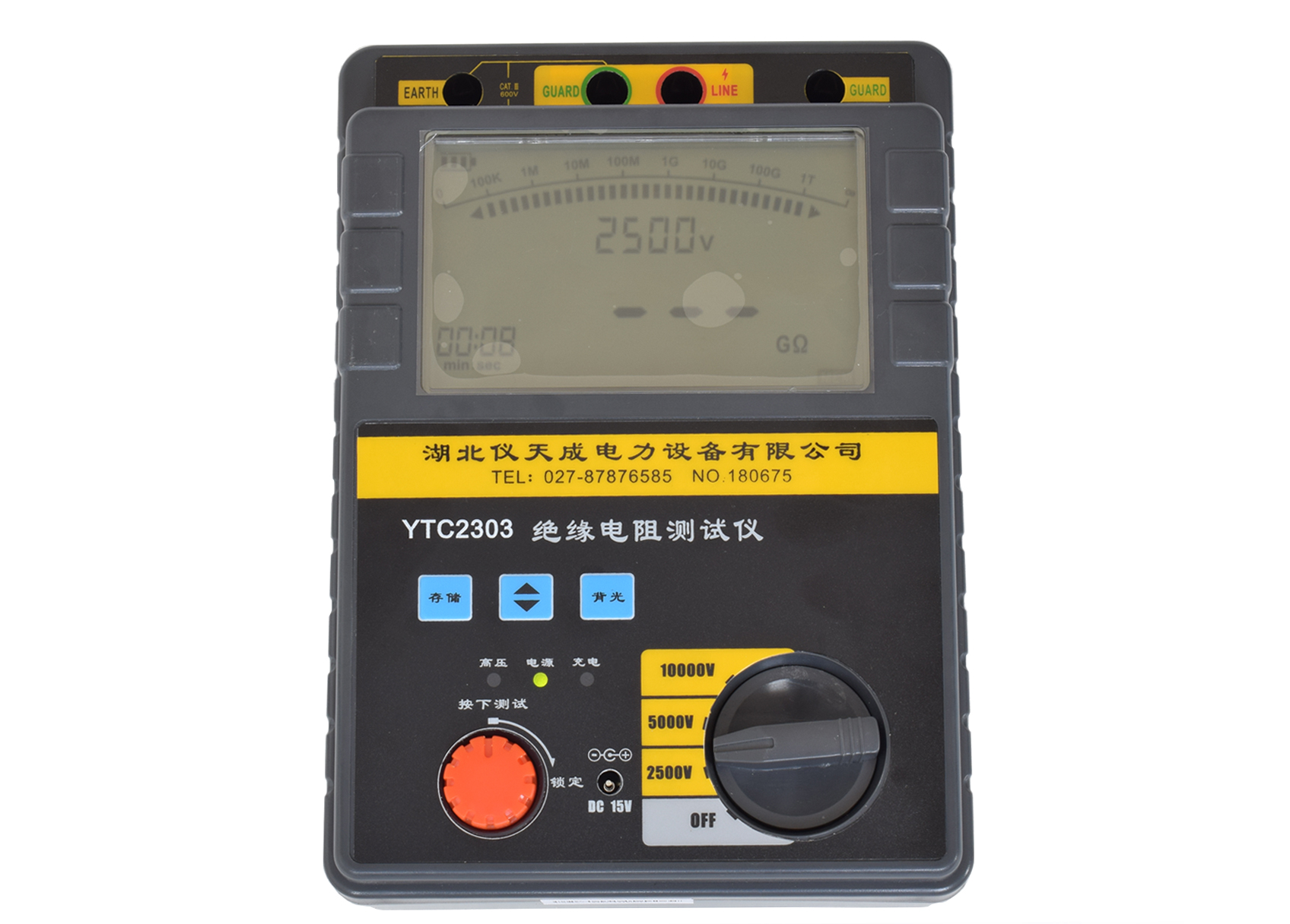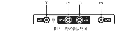 3、將帶高壓測試線紅色插頭端插入(3)LINE端,綠色插頭端插入(2)GUARD端,另一端探針或夾子接于被試設備的高壓導體上。將測試線副線(綠色)插入(2)GUARD端(右手邊),另一端接于被試設備的高壓護環(huán)上,以消除表面泄漏電流的影響(詳見“屏蔽端的使用方法”相關內容。將另外一根黑色副線測試線插入地端(EARTH)(1)端,另一頭接于被試設備的外殼或地上。