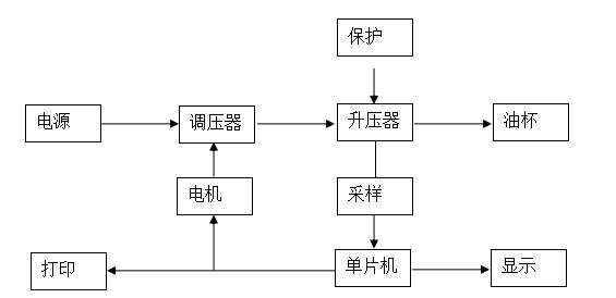 油試驗(yàn)的交流高壓電壓從調(diào)壓器的輸出經(jīng)過升壓而得,硬件保護(hù)電路可以識(shí)別油樣是否被擊穿,油樣擊穿時(shí)保護(hù)電路通過硬件自動(dòng)截?cái)嗌龎浩鞯妮斎耄瑫r(shí)單片機(jī)控制步進(jìn)電機(jī)使調(diào)壓器返回到零位。調(diào)壓器的升降過程和儀器的升壓速度都是由單片機(jī)根據(jù)具體的試驗(yàn)程序控制步進(jìn)電機(jī)的旋轉(zhuǎn)來實(shí)現(xiàn)的。在整個(gè)升壓過程中一起顯示油杯中電極之間所承受的電壓值,單位為kV,并把發(fā)生擊穿前瞬間的電壓值作為試油單次試驗(yàn)的擊穿電壓。