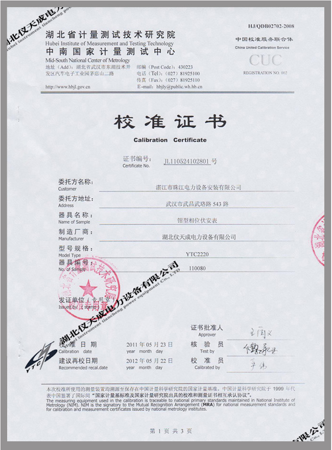 轉(zhuǎn)載:"YTC2220數(shù)字雙鉗相位伏安表鑒定證書" 請注明來源于儀天成電力。 更多技術(shù)問題請致電儀天成電力客戶服務(wù):027-87876585,技術(shù)部專線:027-87876585,在線客服: