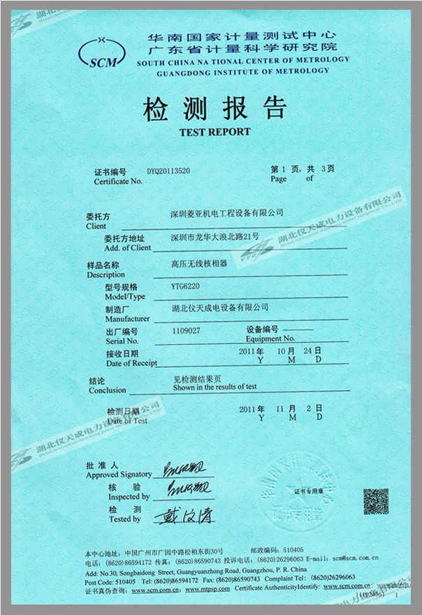 轉(zhuǎn)載:"YTC6220高壓無線核相器鑒定證書" 請注明來源于儀天成電力。 更多技術問題請致電儀天成電力客戶服務:027-87876585,技術部專線:027-87876585,在線客服:719388481